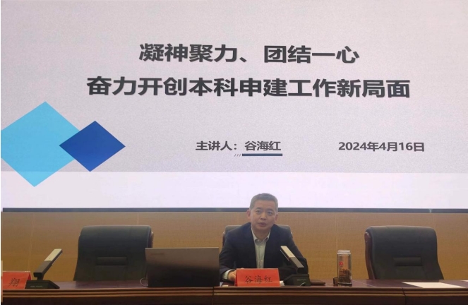 的发展规划,探究了本科申建工作情况及存在的问题,并对做好本科申建工作提出了在工作中要增强“主人翁”意识,种好本科申建“责任田”;要振奋精神、加压奋斗,跑出本科申建“加速度”;要艰苦奋斗、努力拼搏,争当本科申建“实干家”等三点具体要求。