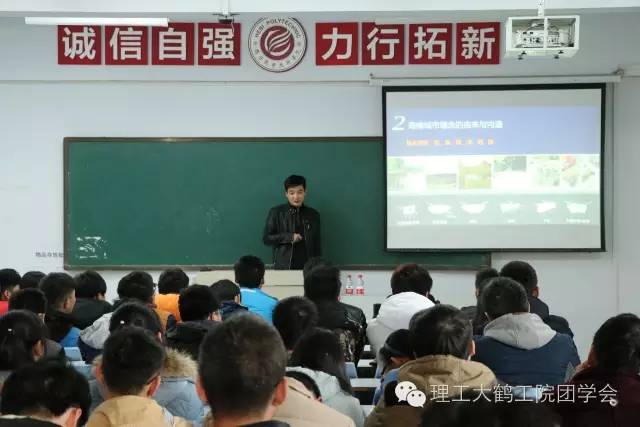 周飞祥介绍了新一代城市雨洪管理概念,以大量详实的图片讲解了鹤壁海绵城市已建、在建项目,并通过引用海绵城市中常用的一些蓄水、渗水、净水手段使同学们了解到建设海绵城市以“蓄、渗、滞、净、用、排”为基本原理,以“慢排缓释”和“源头分散”控制为主要规划设计理念,保证城市内涝缓解与控制,雨水资源化利用,城市景观塑造与改善。报告会后,他与同学们分享了大学期间学习与学生工作心得,鼓励大家利用所学专业知识参与鹤壁海绵城市建设,服务社会。