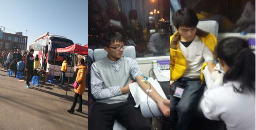 团委志愿者联合会为了弘扬无私奉献的精神,积极宣传,鼓励同学们参加献血活动在献血前需要进行血型检查,然后才能排队等候抽血。天气虽寒,但无法阻挡同学们的一腔热血,献血车先排起了几十米的长队,献过血的同学会得到小礼物和献血证,但更重要的是,同学们那一颗为他人无私奉献的爱心。